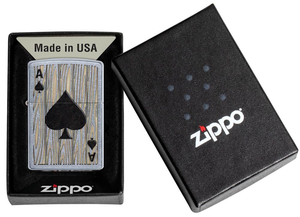Another lighter is being added to the wildly famous Ace lighters collection. This Ace of Spaces design is color imaged on a Street Chrome lighter and displays a wood grain background. Comes packaged in a gift box. For optimal performance fill with Zippo lighter fuel.