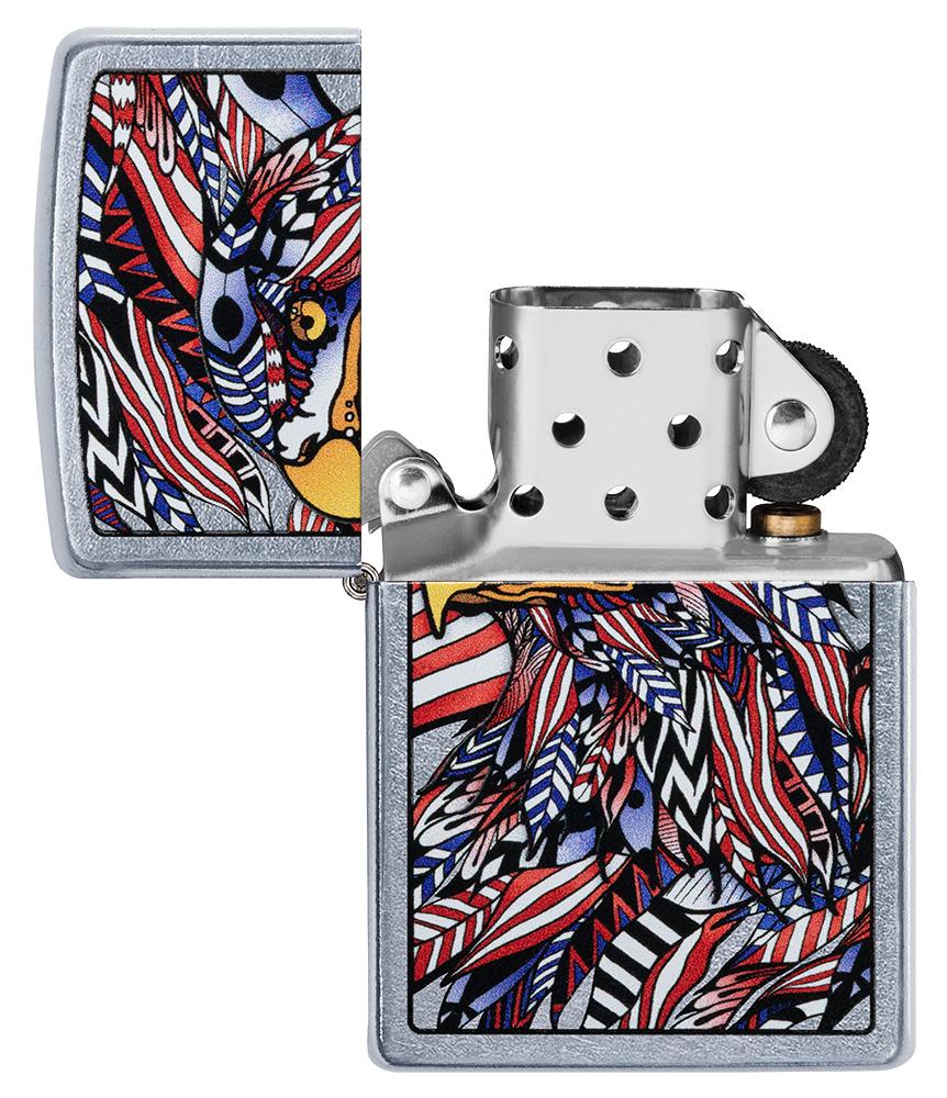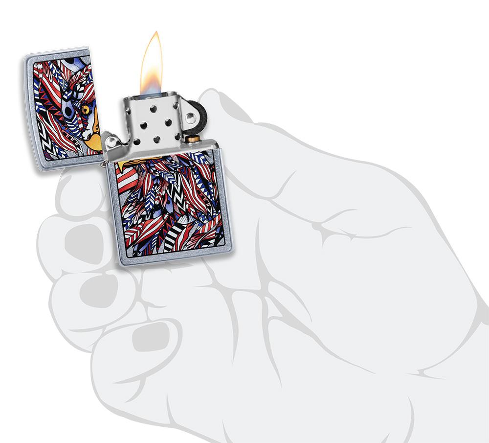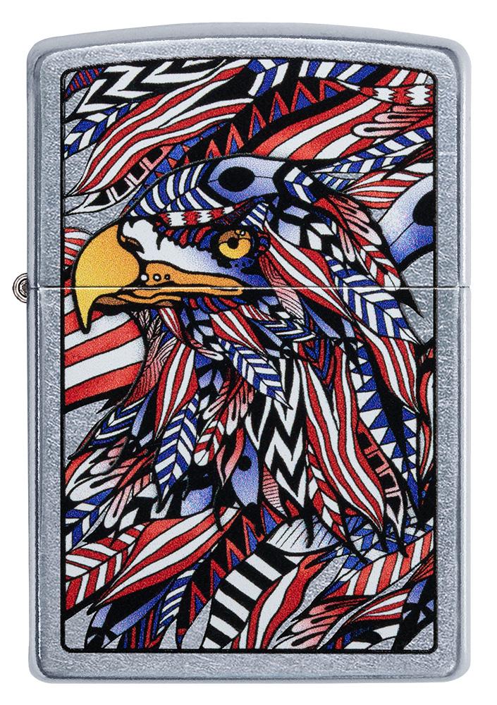 Express your love for all things USA with this American Eagle Design. This piece takes the majestic Bald Eagle and puts an American twist to it, exchanging its traditional brown and white feathers for our nations red, white, and blue. This patriotic design is color imaged on a Street Chrome lighter. Comes packaged in a gift box. For optimal performance fill with Zippo lighter fuel.