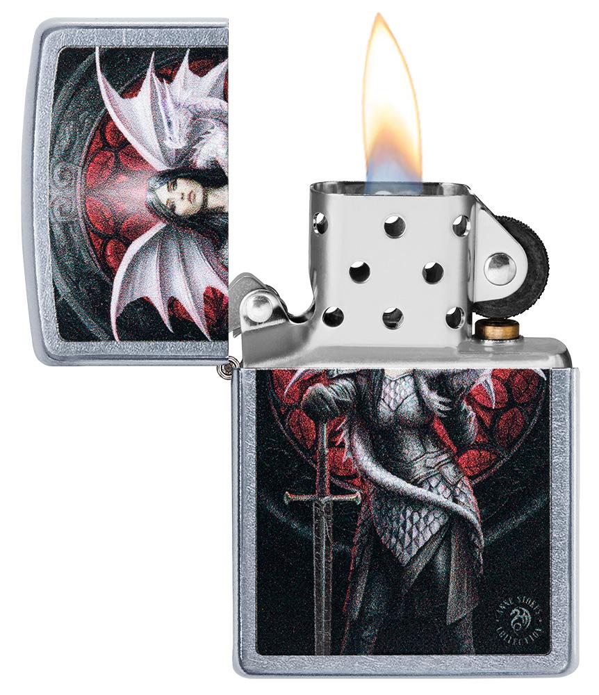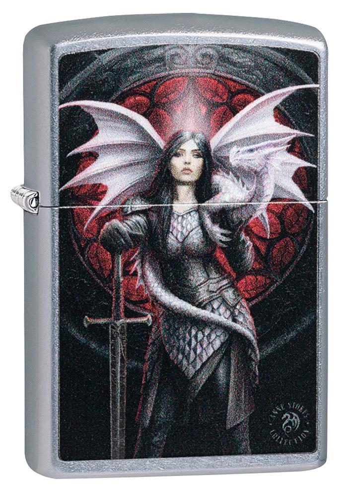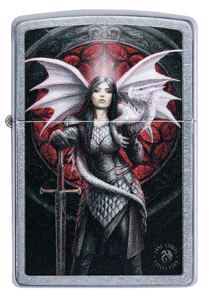 This dragon warrior design by Anne Stokes is not one to be trifled with. This design is featured on a Street Chrome lighter and depicts a fearless female warrior, with her glacial white dragon perched upon her shoulder. Comes packaged in a gift box. For optimal performance, fill with Zippo lighter fuel.