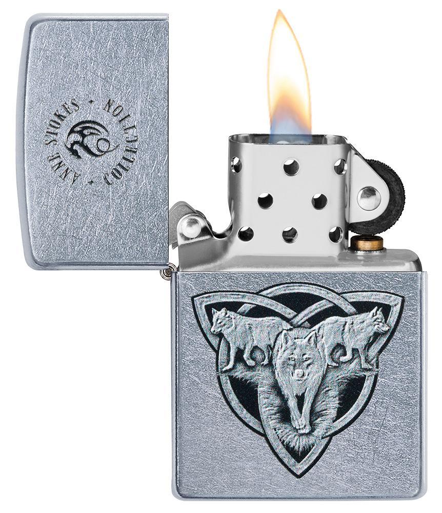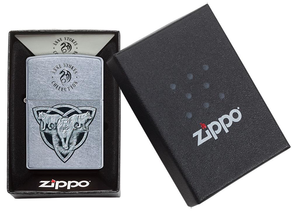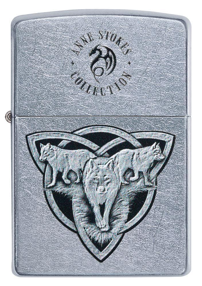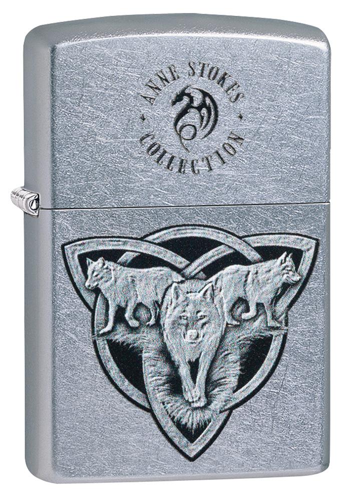 Who is part of your pack? On this Street Chrome™ lighter, Anne Stokes creates a simple yet brilliant depiction of a pack of three wolves with a trinity knot in the background, with the Anne Stoke logo on the lid for the finishing touch. Comes packaged in a gift box. For optimal performance, fill with Zippo lighter fuel.