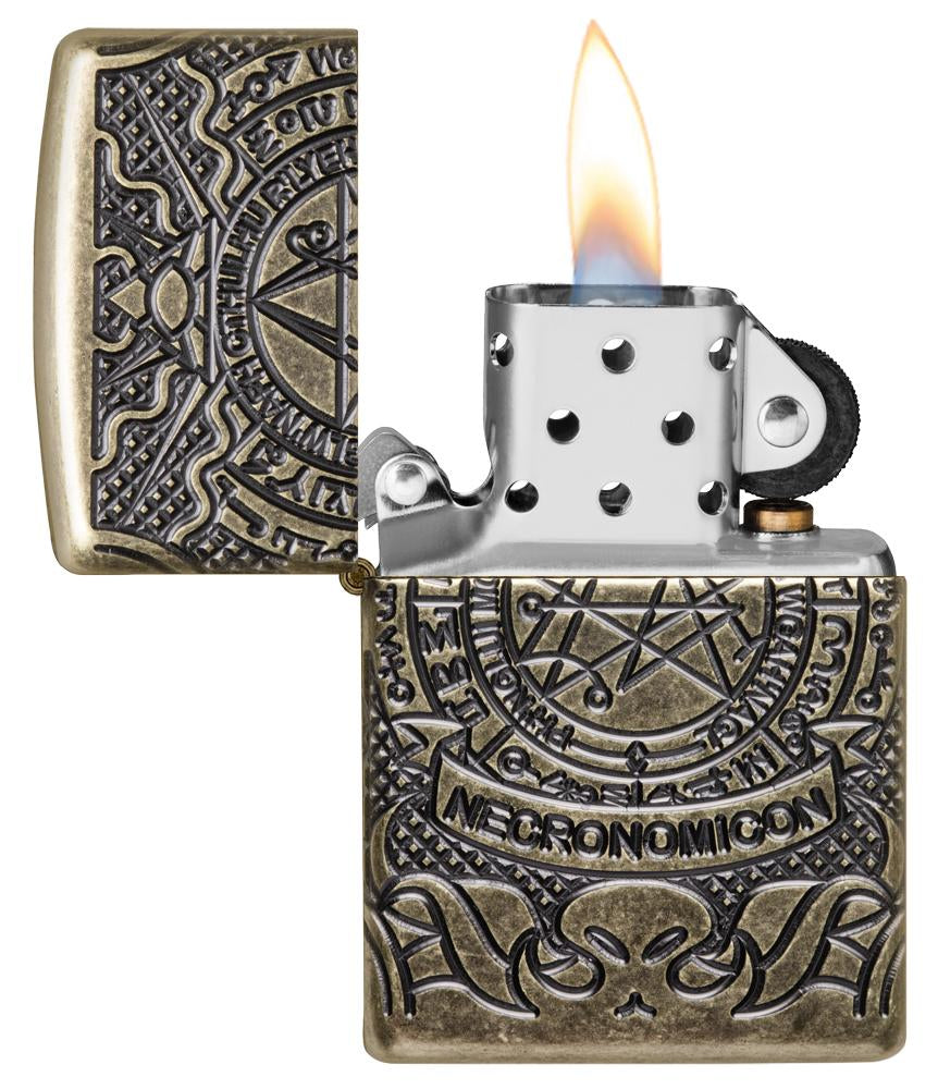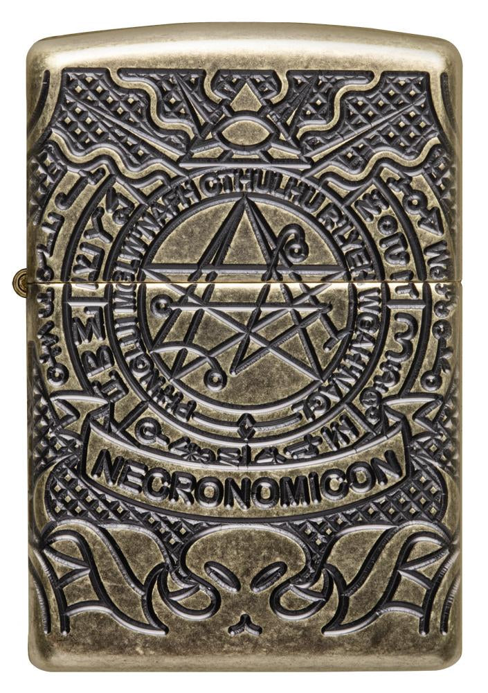 This lighter appears as the first of its kind on zippo.com! The lighter was inspired by the horrifying stories told by H.P. Lovecraft and playing from our best selling "Monster Design". This Armor® Antique Brass case incorporates classic occult and horror elements, that can be seen in H.P. Lovecraft's Necronomicon. Using the antiquing process, artists are able to enhance the esoteric iconography present in the design. Comes packaged in a gift box. For optimal performance, fill with Zippo lighter fuel.
