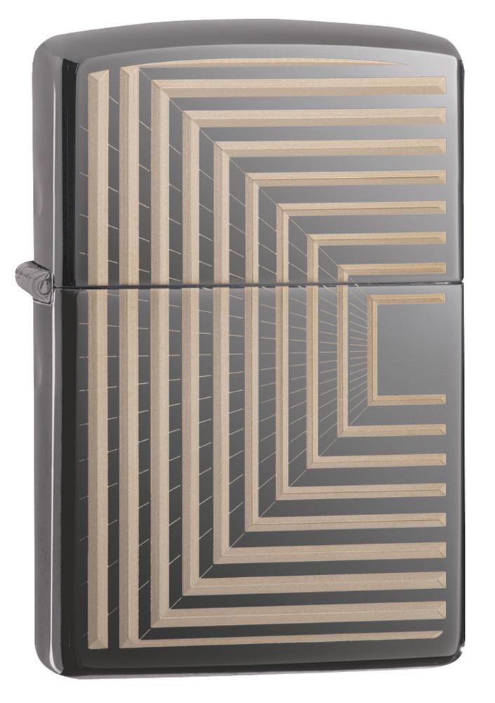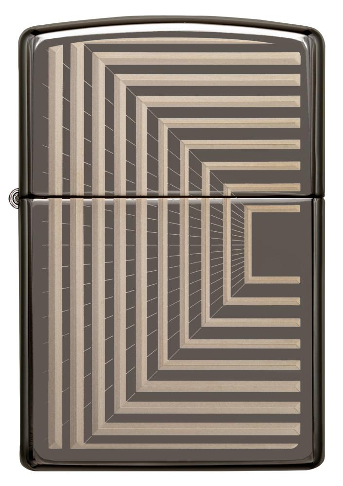 Laser fancy fill is used to create this mesmerizing optical illusion design. Focus on the smallest square on this lighter and the pattern appears to be moving forward. This design is finished on a Black Ice® base model. Comes packaged in a gift box. For optimal performance, fill with Zippo lighter fuel.