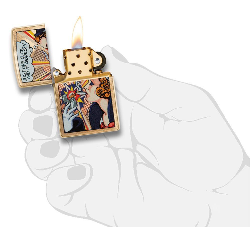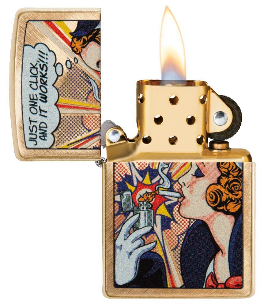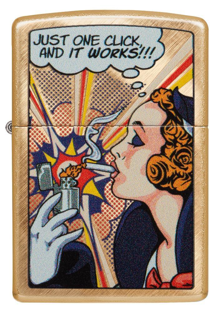 Check out this new take on a classic Windy design. This time Windy appears on a Herringbone Sweep Brass lighter. Using color imaging artists created a comic like design. A new twist on a timeless piece, perfect for any collector. Comes packaged in a gift box. For optimal performance, fill with Zippo lighter fuel.