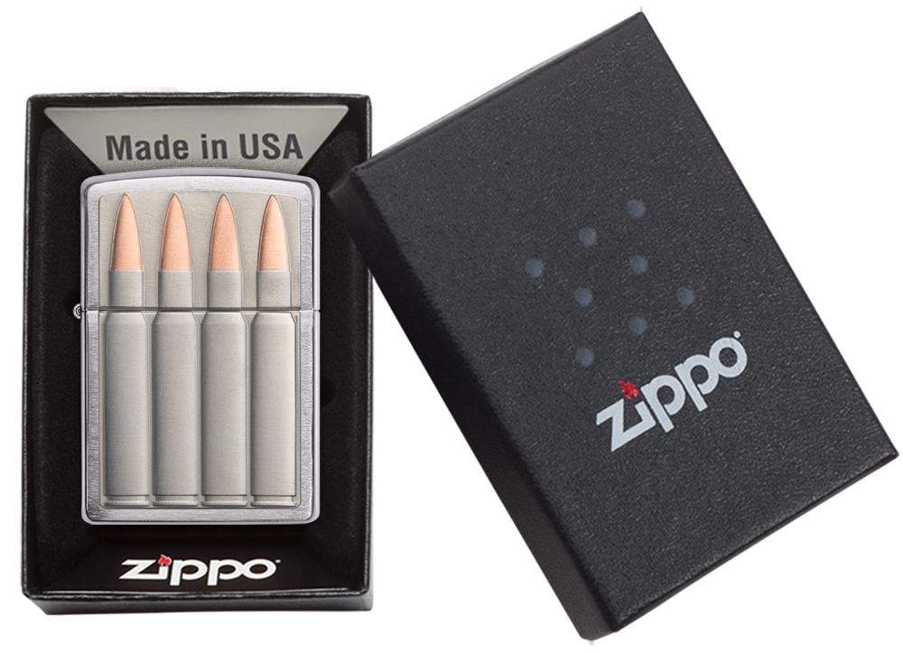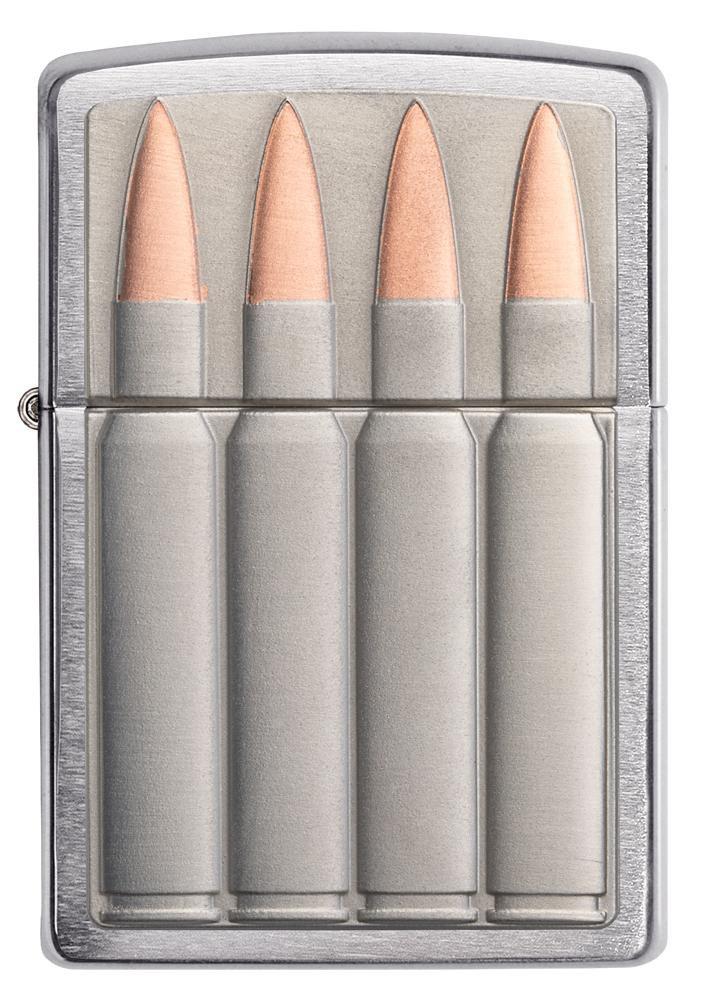 A perfect gift for outdoors-men. This ammunition emblem features real copper accents on the rifle bullet heads and finished on a Brushed Chrome lighter. With the real copper accents the design on this lighter could deteriorate or tarnish overtime. Comes packaged in a gift box. For optimal performance, fill with Zippo lighter fuel.
