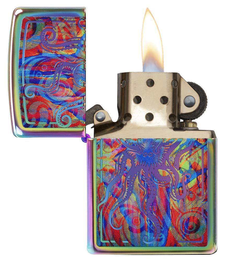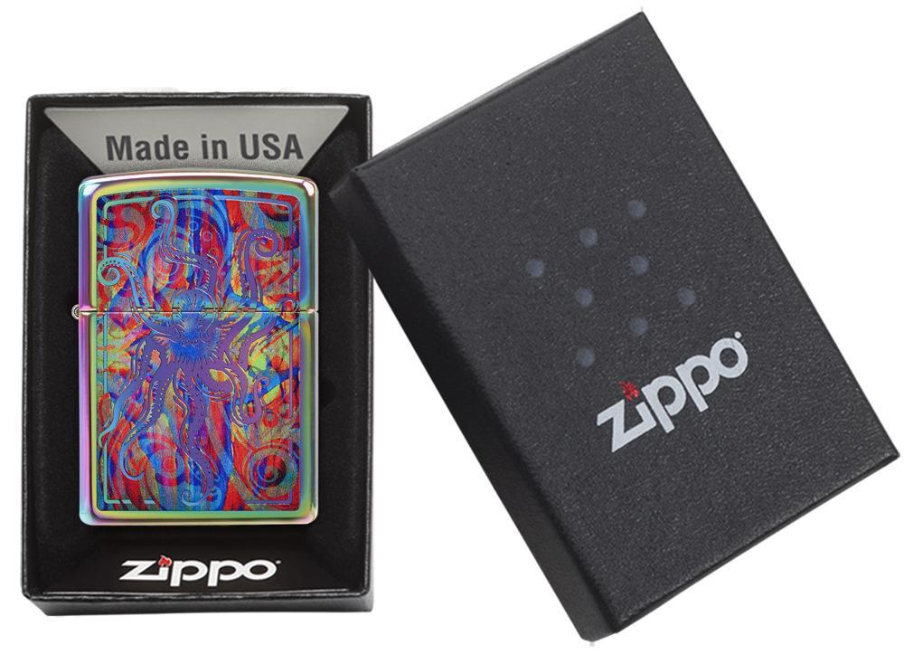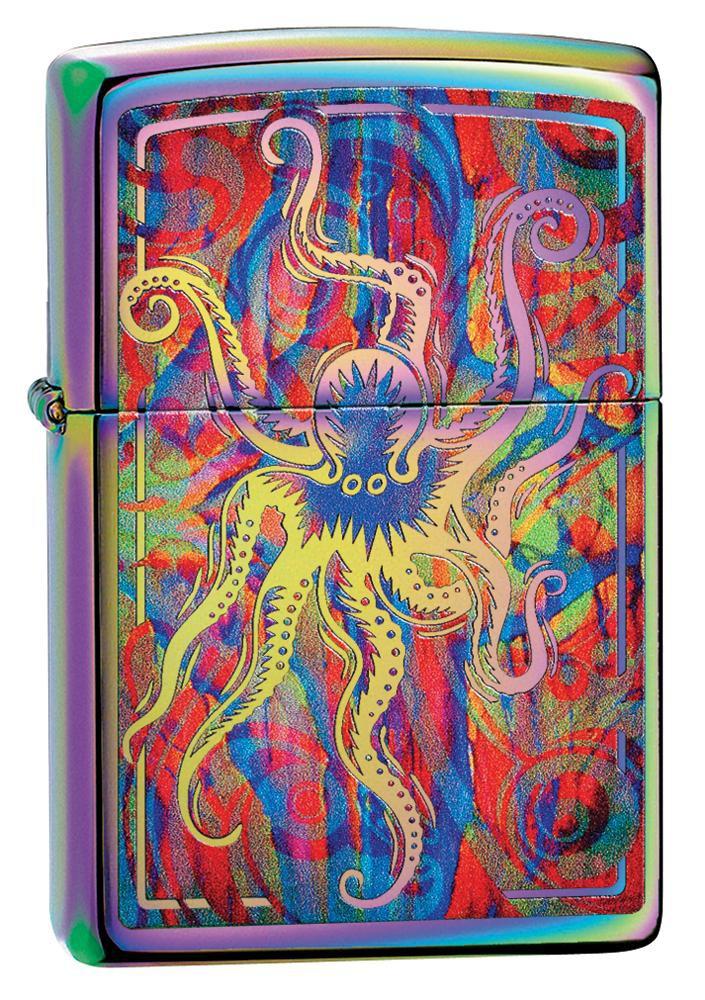 Add a splash of color to your Zippo lighter collection with the debut of this octopus lighter as the first of its kind on zippo.com. The octopus design is color imaged onto a Multi Color lighter to add vibrancy to this deep sea creature. Comes packaged in a gift box. For optimal performance, fill with Zippo lighter fuel.