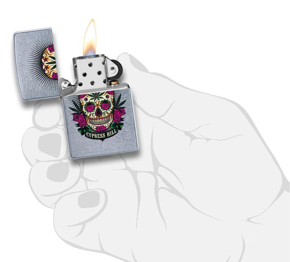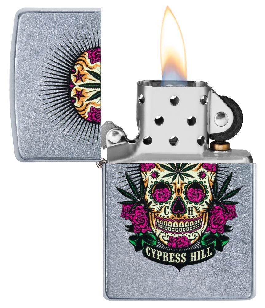 Go insane with this new Street Chrome lighter. This lighter features a color imaged sugar skull design. Displayed around the sugar skull are marijuana leaves and on the face American hip hop group, Cypress Hill's, logo. Comes packaged in a gift box. For optimal performance, fill with Zippo lighter fuel.