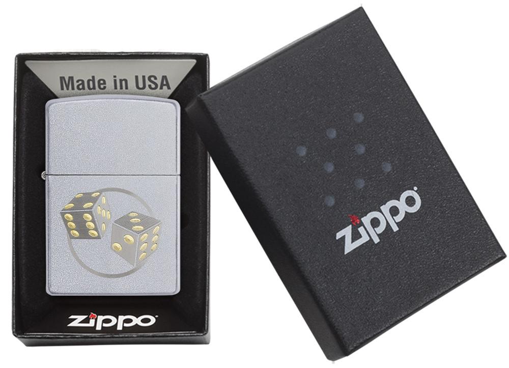 This unique engraved lighter has created a striking look of two dice. The auto two-tone design on a Satin Chrome™ lighter is surely an attractive look at an attractive price point. Comes packaged in a gift box. For optimal performance, fill with Zippo lighter fuel.