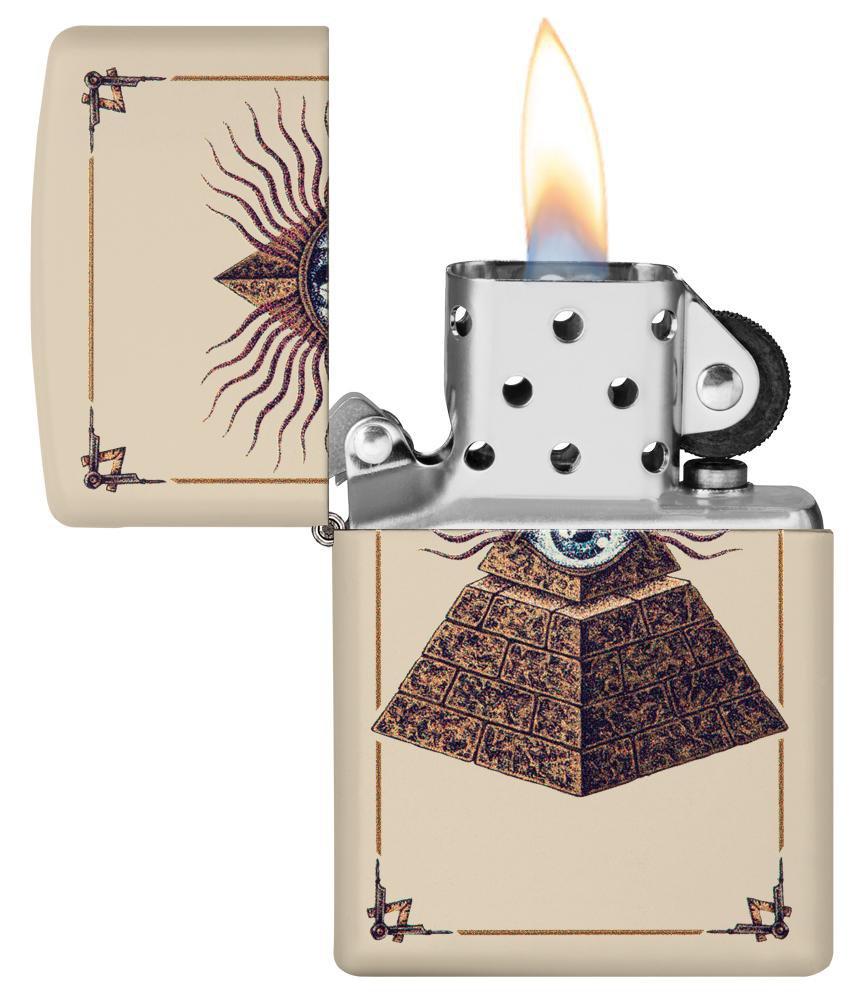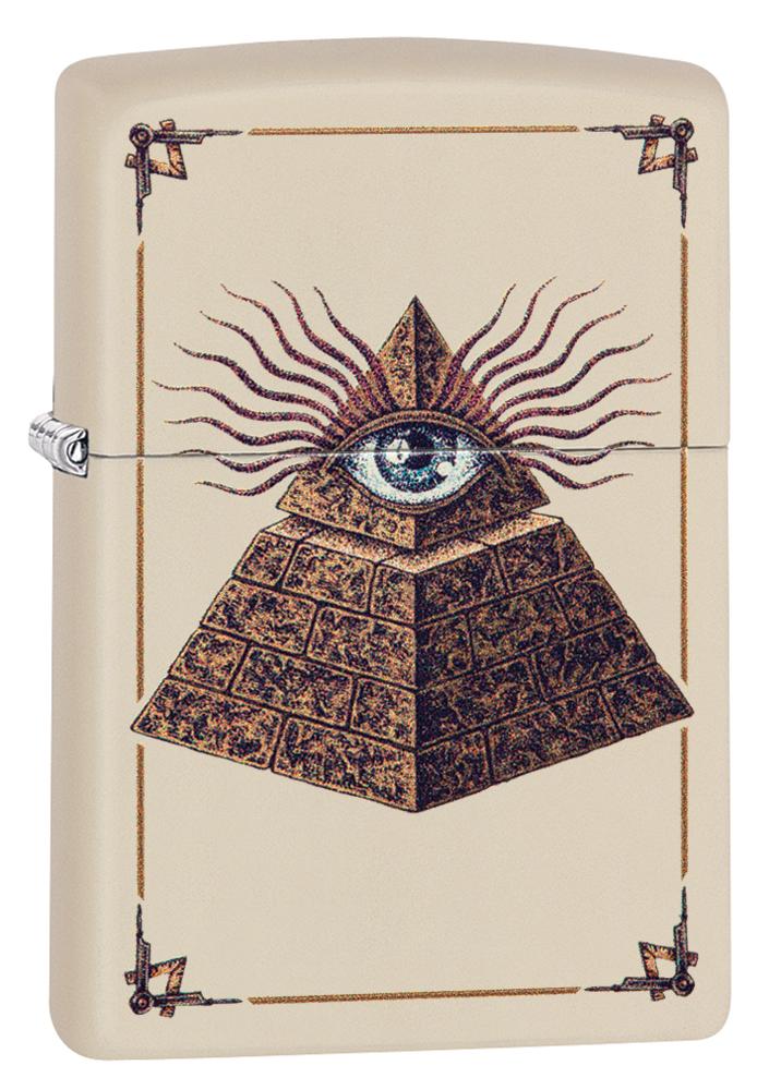 This lighter makes its debut as the first of its kind on zippo.com! This Eye of Providence design is enclosed in a triangle with rays extending directly from the eye and finished on a cream matte lighter. The Eye of Providence or the all seeing eye represents the divine providence, or the idea that someone is always watching over you. Comes packaged in a gift box. For optimal performance, fill with Zippo lighter fuel.