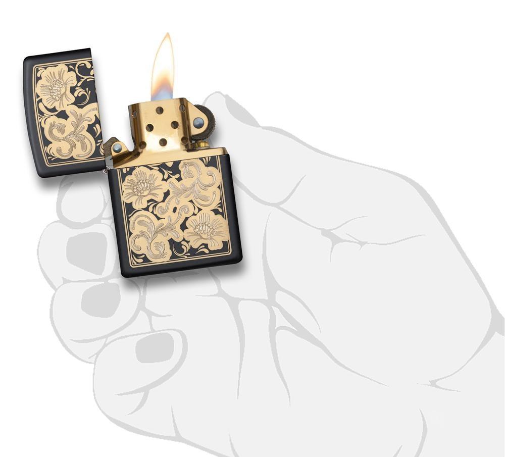 This intricate design features two amazing processes: laser & auto engrave. The bronze filigree is matched with a brass insert. This black matte lighter is classy AND edgy. Comes packaged in a gift box. For optimal performance, fill with Zippo lighter fuel.