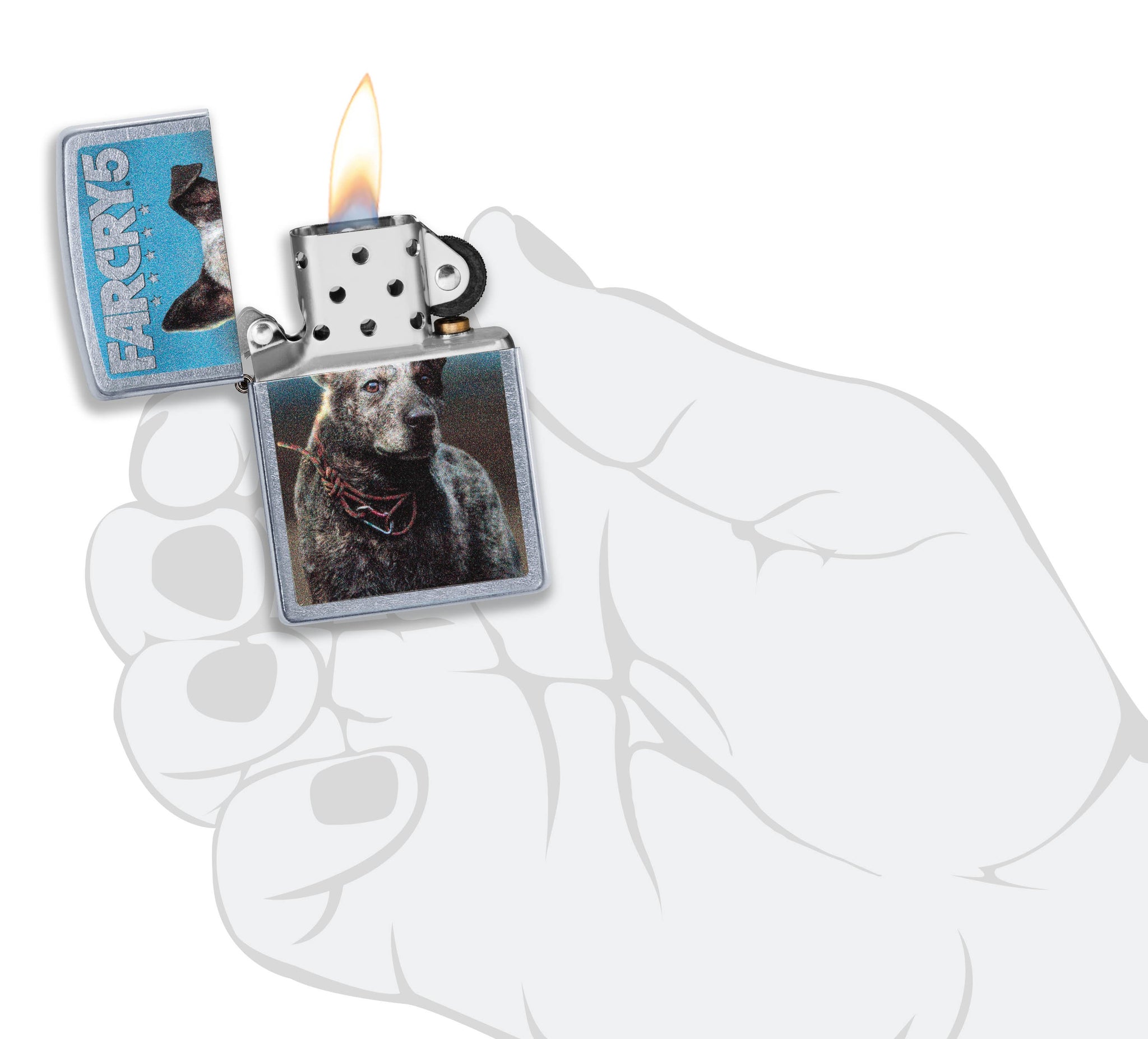 Boomer is here to sit, stay, and attack! This Far Cry® 5 design takes the adorable, yet fierce fang for hire and color images him on a Street Chrome™ lighter with the Far Cry® 5 logo chromed out across the top. So whether you are liberating Hope County from the Project at Eden's Gate cult or showing some love for the good boy himself, make sure to have Boomer by your side. Comes packaged in Zippo's premium box. For optimal performance, fill with Zippo lighter fuel.